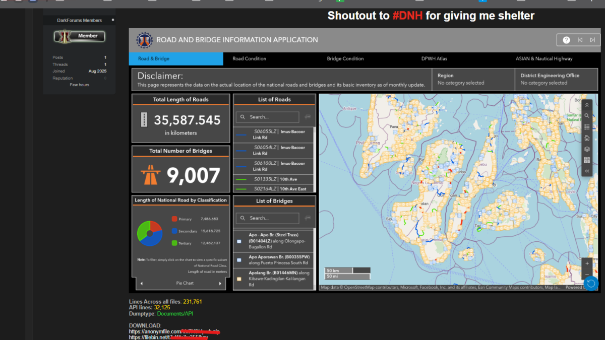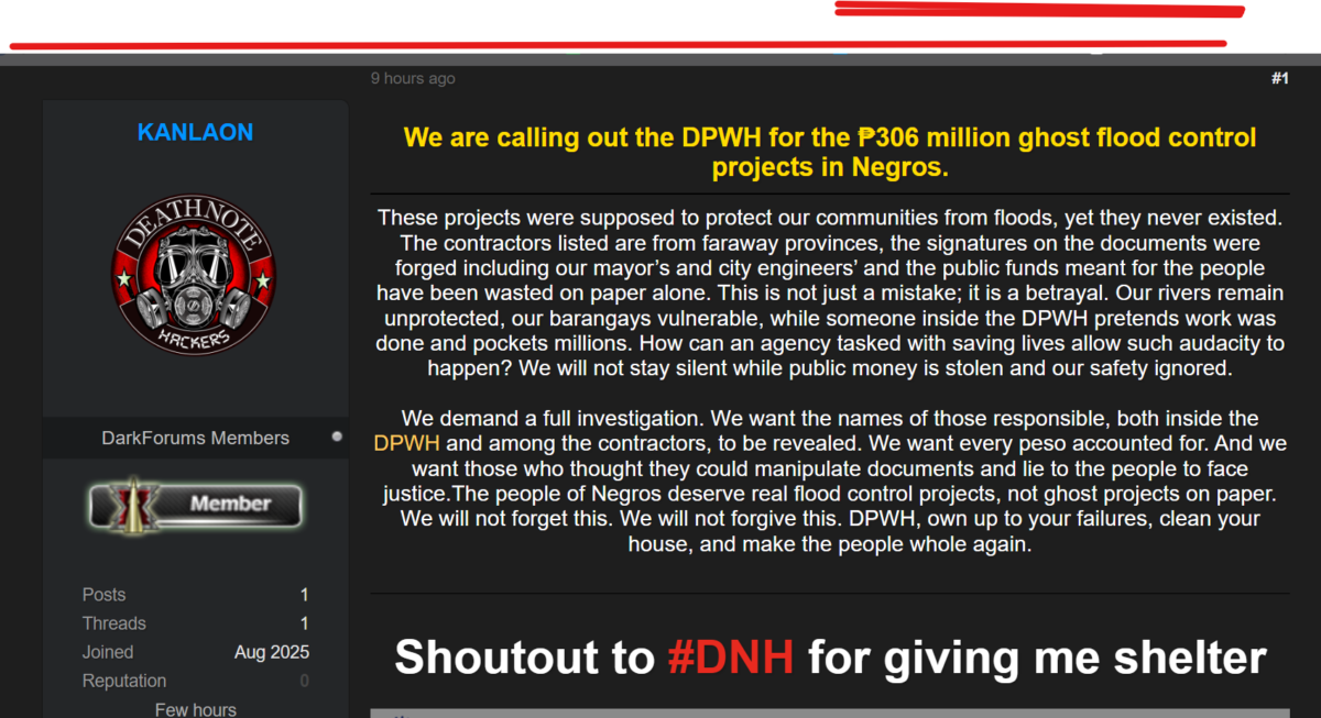 A post on the dark web’s DarkForums by a user under the name “KANLAON” accuses the Department of Public Works and Highways (DPWH) of orchestrating ₱306 million worth of ghost flood control projects in Negros. The anonymous user claims the projects never existed, with forged documents and signatures allegedly used to pocket public funds. This alarming post was found on a notorious hacker forum and is now making rounds across digital underground networks.